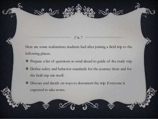 - Here are some realizations students had after joining a field trip to the following places. Prepare a list of questions to send ahead to guide of the study trip. Define safety and behavior standards for the journey there and for the field trip site itself. Discuss and decide on ways to document the trip. Everyone is expected to take notes.