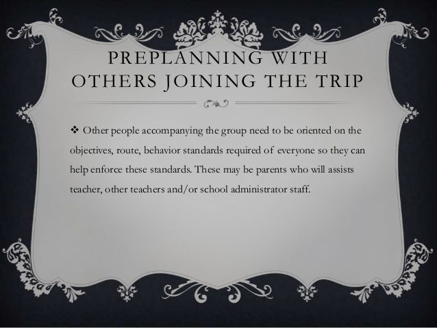 - PREPLANNING WITH OTHERS JOINING THE TRIP Other people accompanying the group need to be oriented on the objectives, route, behavior standards required of everyone so they can help enforce these standards. These may be parents who will assists teacher, other teachers and/or school administrator staff.