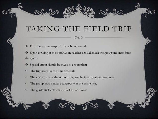 - TAKING THE FIELD TRIP Distribute route map of places be observed. Upon arriving at the destination, teacher should check the group and introduce the guide. Special effort should be made to ensure that: • The trip keeps to the time schedule • The students have the opportunity to obtain answers to questions. • The group participates courteously in the entire trip. • The guide sticks closely to the list questions.
